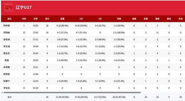 從數(shù)據(jù)來看,遼寧U17輸球一點也不冤,投籃命中率只有35%,怎么可能去贏球呢?而對手命中率47.6%,真是遙遙領(lǐng)先。而在護筐層面,廣州龍獅搶到43個籃板球,而遼寧隊僅32分。全隊的助攻僅4次,可以說,毫無團隊可言,慘敗也就好理解了。